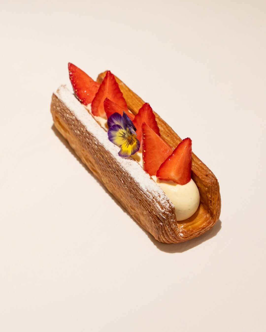 Topped with fresh strawberries, it offers a refined balance of bright fruit and gentle creaminess — light, elegant, and beautifully layered in every bite.